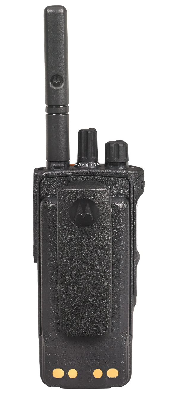 Orange button on the top of the radio can be programmed to send an alert to a supervisor or dispatcher during an emergency situation